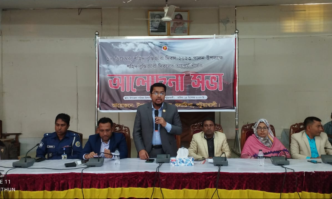 ১৪ ই ডিসেম্বর /২৩ শহীদ বুদ্ধিজীবী দিবসে উপজেলা প্রশাসনের আয়োজনে যথাযথ মর্যাদায় উপজেলা পরিষদ হলরুমে বেলা ১১টায় বিভিন্ন শ্রেণী পেশা জীবী, রাজনৈতিক নেতৃবৃন্দ, সরকারি কর্মকর্তা, শিক্ষা প্রতিষ্ঠান প্রধান, মুক্তিযোদ্ধাসহ গণমাধ্যম কর্মীদের সমন্বয়ে দেশের প্রথিত যশা বুদ্ধি জীবিদের হত্যা দিবসের তাৎপর্যপূর্ণ বিষয়ে আলোচনা সভা অনুষ্ঠিত হয়। সভায় সভাপতিত্ব করেন নির্বাহী অফিসার মোঃ মহিউদ্দিন আল হেলাল। প্রধান অতিথি হিসেবে বক্তব্য রাখেন আওয়ামী লীগের যুগ্ম সম্পাদক ও উপজেলা চেয়ারম্যান মোঃ শাহীন শাহ। বিশেষ অতিথি হিসেবে ছিলেন সহকারি কমিশনার ভূমি মোঃ নাছিম রেজা, অফিসার ইনচার্জ মোঃ ফেরদৌস আলম খান, কৃষি অফিসার আরজু আক্তার, উপজেলা সিনিয়র মৎস্য অফিসার মোঃ জহুরুননবী, শিক্ষা অফিসার মীর রেজাউল ইসলাম, মাধ্যমিক শিক্ষা অফিসার মোঃ রেজাউল করিম, নির্বাচন অফিসার মোঃ জহিরুল ইসলাম, প্রকল্প বাস্তবায়ন কর্মকর্তা খোকন চন্দ্র দাস প্রমূখ। এ ছাড়া মুক্তিযোদ্ধা সংসদের বীর মুক্তিযোদ্ধা নিজাম উদ্দিন তালুকদার ও মোঃ শামসুউদ্দিন সানু ঢালী উপস্থিত ছিলেন। বক্তব্য রাখেন প্রেসক্লাব সভাপতি মু খালিদ হোসেন মিলটন, গলাচিপা সরকারি মডেল হাই স্কুলের প্রধান শিক্ষক মোঃ নিজাম উদ্দিন। সভায় প্রধান অতিথি এবং সভাপতি বলেন দেশের শহীদ বুদ্ধিজীবীদের তালিকা প্রণয়ন সহ ঐ স্বাধীনতা বিরোধী দোসরদের নাম প্রকাশসহ শাস্তি ও বিচারের দাবি জানায়।এই স্বাধীন বাংলাদেশে নতুন প্রজন্মের কাছে শহীদ বুদ্ধিজীবীদের জীবনা দর্শন বিষয়ে শিক্ষার্থীদের মাঝে তথ্য চেতনা সমৃদ্ধ করার ক্ষেত্রে রাষ্ট্রের কাছে ও দেশপ্রেমিক বুদ্ধিজীবী ও ইতিহাস বীদদের কাছে অনুরোধ জানায় ।