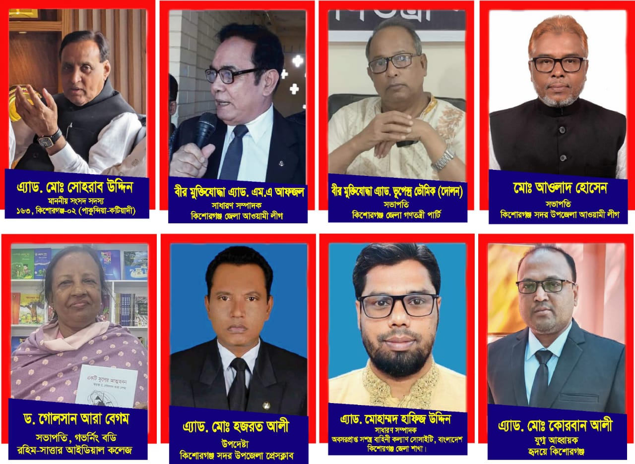 কিশোরগঞ্জ-২ (পাকুন্দিয়া+কটিয়াদী) আসনের সংসদ সদস্য এডভোকেট মো:সোহরাব উদ্দিন,কিশোরগঞ্জ জেলা আওয়ামী লীগের সাধারণ সম্পাদক বীর মুক্তিযোদ্ধা এডভোকেট এম.এ.আফজল,গণতন্ত্রী পার্টি,কেন্দ্রীয় কমিটির সাধারণ সম্পাদক এবং কিশোরগঞ্জ জেলা শাখার সভাপতি বীর মুক্তিযোদ্ধা এডভোকেট ভূপেন্দ্র চন্দ্র ভৌমিক(দোলন),কিশোরগঞ্জ সদর উপজেলা আওয়ামী লীগের সভাপতি এবং বৌলাই ইউনিয়ন পরিষদের চেয়ারম্যান মো:আওলাদ হোসেন,রহিম-ছাত্তার আইডিয়াল কলেজ,গভর্নিং বডির সভাপতি ড.গোলসান আরা বেগম,কিশোরগঞ্জ সদর উপজেলা প্রেসক্লাব এর উপদেষ্টা এডভোকেট মো:হজরত আলী,অবসর প্রাপ্ত সশস্ত্র বাহিনী কল্যাণ সোসাইটি বাংলাদেশ,কিশোরগঞ্জ জেলা শাখার সাধারণ সম্পাদক এডভোকেট মোহাম্মদ হাফিজ উদ্দিন এবং 'হৃদয়ে কিশোরগঞ্জ' সংগঠনের যুগ্ম আহ্বায়ক এডভোকেট মো: কোরবান আলী 'দৈনিক সমাজ সংবাদ' পত্রিকার ৯ম প্রতিষ্ঠা বার্ষিকী উপলক্ষে নিম্নোক্ত একই ফরমেটে স্থানীয় বিশিষ্টজনদের অগ্রীম শুভেচ্ছা বার্তা গ্রহণে স্বাক্ষর প্রদান করেছেন ।