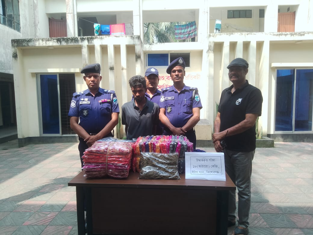 কিশোরগঞ্জ জেলার ইটনা থানার অফিসার ইনচার্জ মোঃ জাকির রব্বানী এর নেতৃত্বে এসআই(নিঃ) উজ্জল মিয়া গোপন সংবাদের ভিত্তিতে সঙ্গীয় অফিসার ফোর্সের সহায়তায় ০৬/০৪/২০২৪ খ্রিঃ সকাল ০৯:২০ ঘটিকায় ইটনা থানাধীন ৩নং মৃগা ইউপিস্থ লাইমপাশা বাশেঁর ব্রীজের পূর্বপাড়ে অটোস্ট্যান্ডের উত্তর পাশে কাঁচা রাস্তার উপর অভিযান পরিচালনা করে আসামি ১. মোঃ খোকন মিয়া (২৬), পিতা- আবু তাহের, মাতা- তাসলিমা বেগম, সাং- লোহাইদ (মোল্লাবাড়ি), থানা- মাধবপুর, জেলা- হবিগঞ্জকে আটক করেন এবং আসামীদের হেফাজত হতে ১৮(আঠারো) কেজি গাঁজা উদ্ধার করে সকাল ১০:৩০ ঘটিকায় জব্দ তালিকা মূলে হেফাজতে গ্রহণ করেন। এ ঘটনায় ধৃত আসামির বিরুদ্ধে ইটনা থানায় মাদকদ্রব্য নিয়ন্ত্রণ আইনে মামলা রুজু করা হয়েছে।