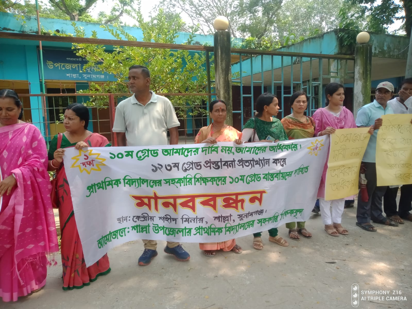 সারা দেশের ন্যায় শাল্লা উপজেলায় নিয়োজিত সরকারি প্রাথমিক বিদ্যালয়ের সহকারি শিক্ষকগন ১০ম গ্রেড বাস্তবায়নের দাবীতে মানববন্ধন করেছেন।