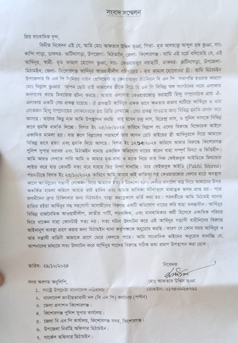 সংবাদ সম্মেলনে অভিযোগ করেন মিঠামইন আওয়ামী লীগের সাংগঠনিক সম্পাদক বিল্লাল তার ছোট ভাই সাবেক আওয়ামী লীগ নেতা ( মৃত) কামালের স্ত্রী আখিনুরকে দিয়ে মিথ্যা বানোয়াট অভিযোগ তৈরি করে পুলিশ সুপারসহ বিভিন্ন স্থানে দিয়ে হয়রানি করছেন সেই সাথে সামাজিক যোগাযোগ মাধ্যমে ফেইসবুকেও মিথ্যা বানোয়াট তথ্য দিয়ে মিথ্যাচার প্রচারের কাজে লিপ্ত হয়ে মিঠামইন উপজেলা বিএনপির সহসভাপতি মো: আফতাব উদ্দিন ভুঁইয়া এর মান সম্মান হানি করেছেন। সেই সাথে গত ২৩/১০/২০২৪ তারিখে আখিনুর তার গুন্ডা বাহীনী দিয়ে আফতাব পরিবারের ওপর আক্রমণ করেন।
