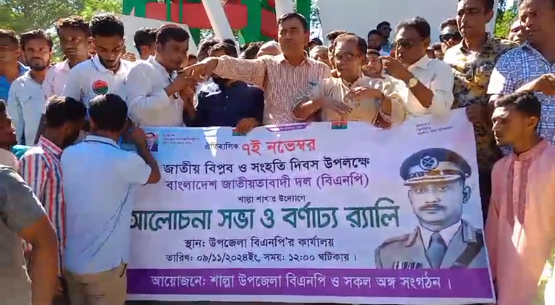 সুনামগঞ্জের শাল্লা উপজেলায় জাতীয়তাবাদী দল বি এন পি শাল্লা শাখার উদ্যোগে ৭ ঐ নভেম্বর বিপ্লব সংহতি দিবস উপলক্ষে বর্ণাঢ্য শোভাযাত্রা ও আলোচনা সভার আয়োজন করা হয়েছে।