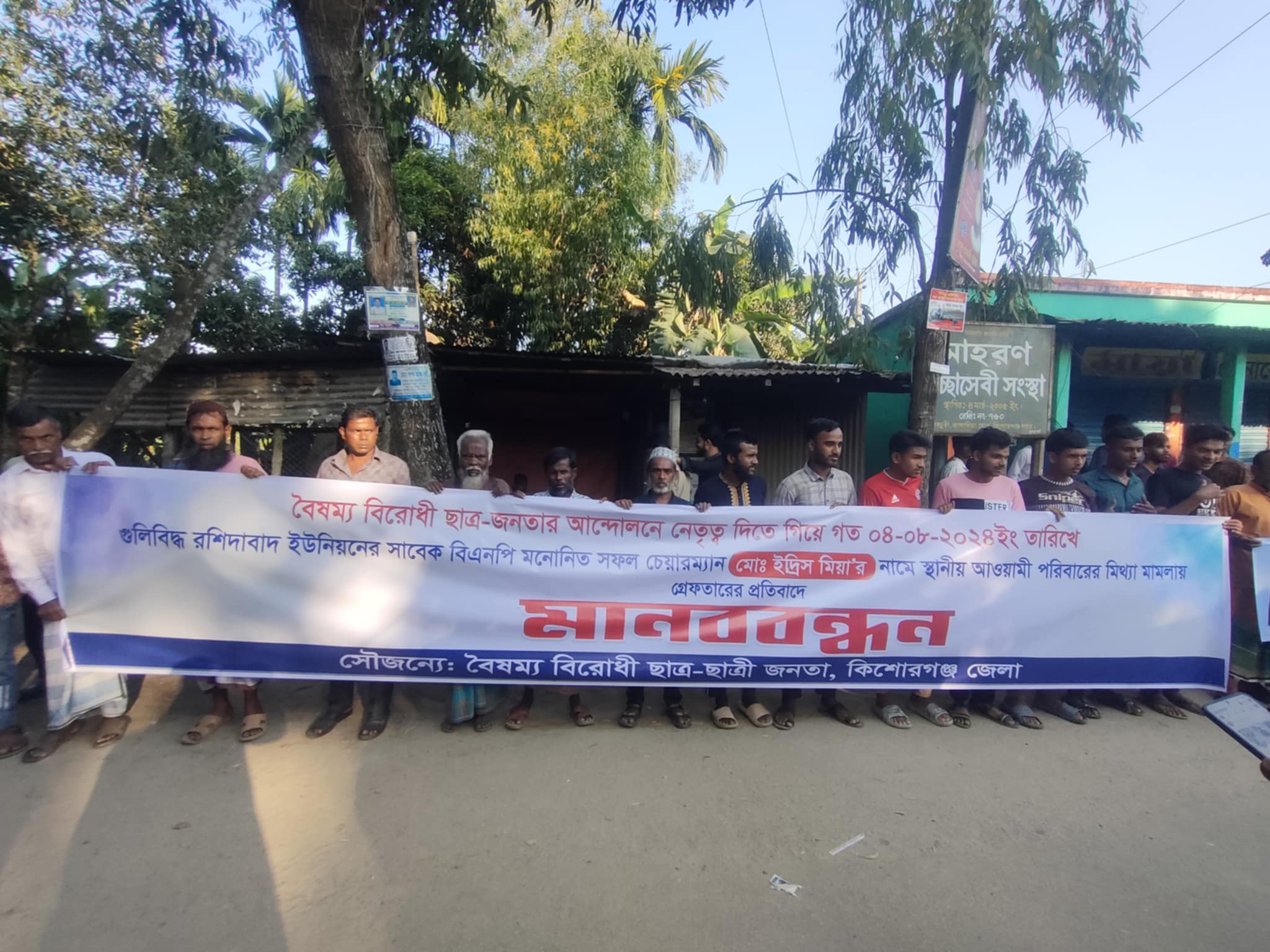 রশিদাবাদ ইউনিয়ন পরিষদের সাবেক চেয়ারম্যানকে গ্রেপ্তারের প্রতিবাদে মানববন্ধন হয়েছে। শুক্রবার (১৫ নভেম্বর) বিকেলে সদর উপজেলার রশিদাবাদ ইউনিয়নের ব্রাক্ষ্মণকচুরি জাঙ্গালিয়া মোড়ে বৈষম্য বিরোধী ছাত্র-ছাত্রী জনতার ব্যানারে নারী-পুরুষসহ হাজারো গ্রামবাসী এ মানববন্ধন করেন।
