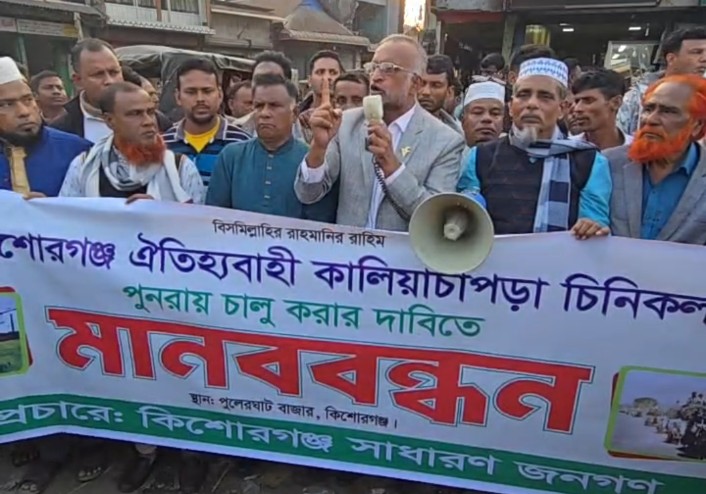 কিশোরগঞ্জের ঐতিহ্যবাহী কালিয়াচাপড়া চিনির কল পুনরায় চালু করার দাবী নিয়ে কিশোরগঞ্জের সাধারণ জনগণ মানববন্ধন করেছে।