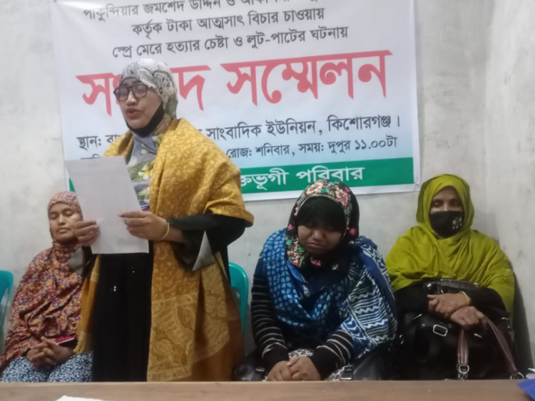 সংবাদ সম্মেলনে লিখিত বক্তব্য পাঠে ফরিদা বলেন, আমি অসহায় বিধবা আমার দুটি এতিম মেয়ে নিয়ে চরম নিরাপত্তাহীনতায় জীবন করছি। আমি আমার জমি বিক্রির ৩৫ লক্ষ্ টাকা কিশোরগঞ্জ সদর উপজেলার লওনা গ্রামের মৃত আহাব উদ্দিনের ছেলে আমার আত্বীয় মোঃ জমসেদ উদ্দিন রজনীগন্ধা সমবায় সমিতি লিঃ, গভঃ রেজি নং ৩০, গত ১ মার্চ ২০২০খ্রিঃ আমার কাছ থেকে নেন।