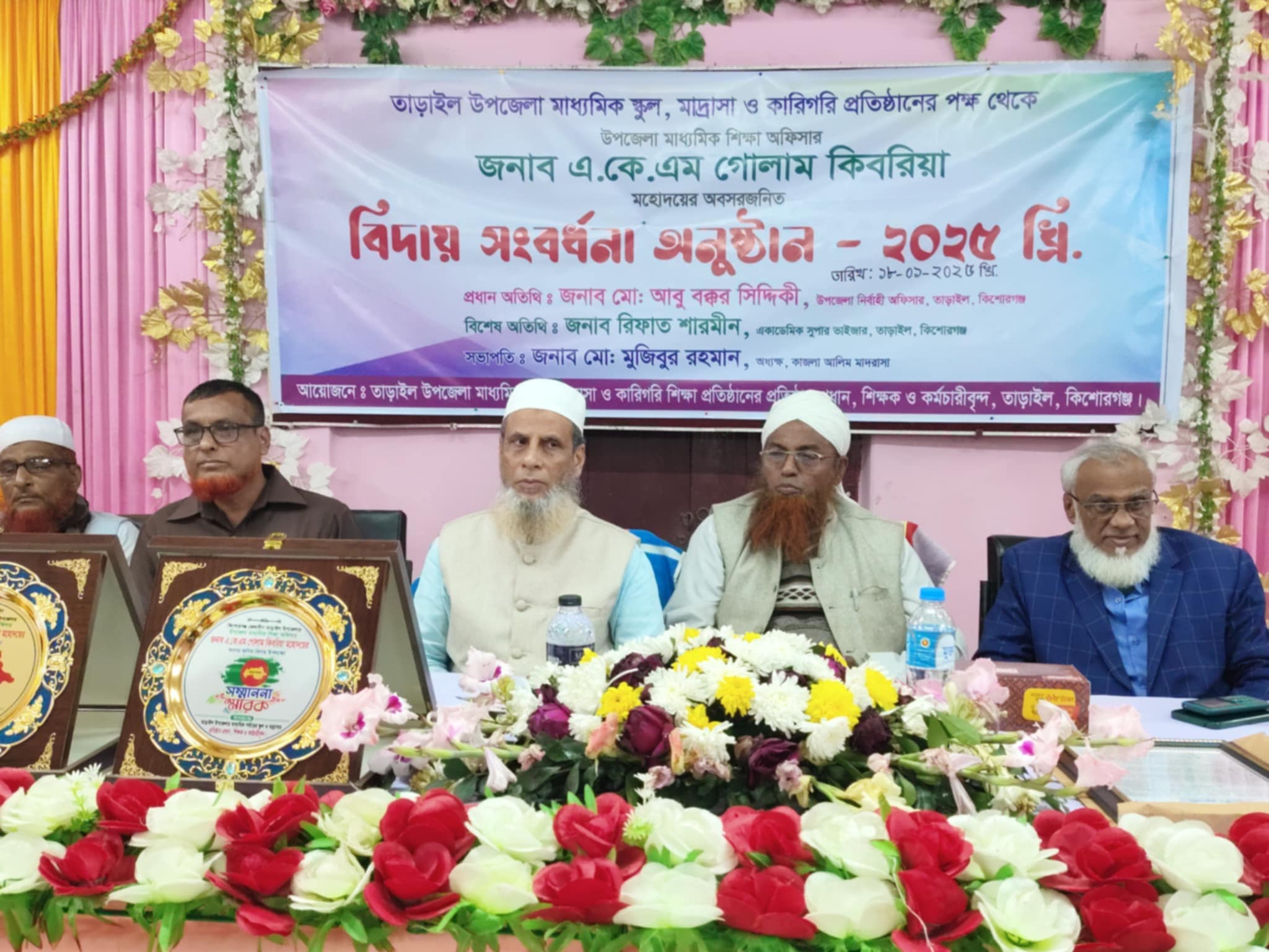 কিশোরগঞ্জে তাড়াইল উপজেলায় ১৮ জানুয়ারি রোজ শনিবার সময় সকাল ১১ ঘটিকায়, উপজেলা পরিষদ মিলনায়তনে, মাধ্যমিক স্কুল, মাদ্রাসা ও কারিগরী প্রতিষ্ঠানের পক্ষ থেকে উপজেলা মাধ্যমিক শিক্ষা অফিসার একে এম গোলাম কিবরিয়ার অবসরজনিত বিদায় সংবর্ধনা অনুষ্ঠান অনুষ্ঠিত হয়েছে।