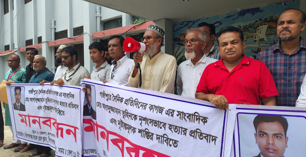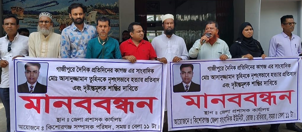 গাজীপুরের দৈনিক পত্রতিদিনের কাগজ পত্রিকার নিহত সাংবাদিক তুহিনকে নৃশংসভাবে হ-ত্যার প্রতিবাদে ও দৃষ্টান্তমূলক শাস্তির দাবিতে কিশোরগঞ্জে মানববন্ধন অনুষ্ঠিত হয়েছে।