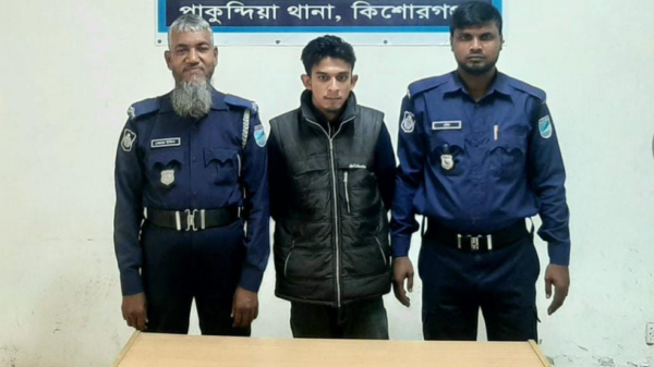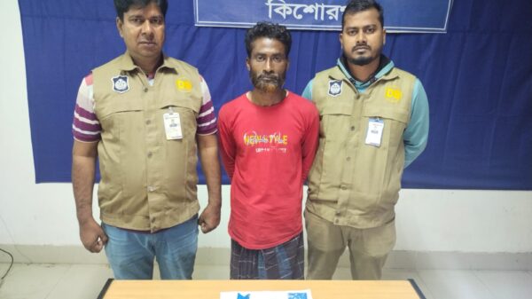 desk report কিশোরগঞ্জ জেলার ইটনা থানার এসআই (নিঃ) উজ্জল মিয়া গোপন সংবাদের ভিত্তিতে সঙ্গীয় অফিসার ফোর্সের সহায়তায় ১৮/০২/২০২৪ খ্রি: ০৮.৪০ ঘটিকায় ইটনা থানাধীন ইটনা সদর ইউপিস্থ বলদা ফেরিঘাট সংলগ্ন ধনু