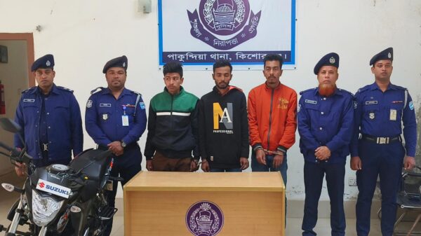 কিশোরগঞ্জের পাকুন্দিয়া থানা এলাকায় পুলিশি অভিযানে রক্ষা পেল তরুনির প্রাণ। অপহরন করতঃ মুক্তিপন দাবী ও দলবদ্ধভাবে ধর্ষনের ঘটনায় পুলিশ কর্তৃক ৩ (তিন) আসামী গ্রেফতার ও অপরাধকর্মে ব্যবহৃত এক মোটরসাইকেল জব্দ।