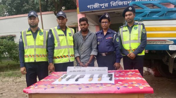 ওসমান গনি মুন্সীগঞ্জ জেলা প্রতিনিধিঃ মুন্সীগঞ্জে গজারিয়া উপজেলা ডাকাতির প্রস্তুতিকালে দেশীয় অস্ত্র ও পিকআপসহ রহিম বেপারী (২৭) নামে এক ডাকাত’কে আটক করেছে হাইওয়ে পুলিশ। এ সময় আরো ৬ ডাকাত পালিয়ে