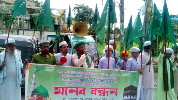 স্টাফ রিপোর্টার : মহানবী হযরত মুহাম্মদ (সা:) কে নিয়ে কটুক্তি ও মাজারে হামলার প্রতিবাদে মানববন্ধন কর্মসূচি করা হয়েছে। আজ বুধবার কিশোরগঞ্জ নতুন জেলখানা মোড়ে সকাল ১১ ঘটিকায় গাউছিয়া নুরানি