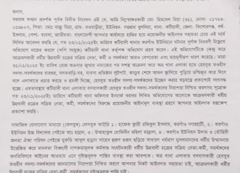 নিজস্ব প্রতিবেদক: কিশোরগঞ্জ জেলার কটিয়াদিতে হেযবুত তাওহীদের সদস্যের বাড়িতে আকিকা অনুষ্ঠানকে কেন্দ্র করে জরুরী সমাবেশ ডেকেছে উলামা তৌহিদী জনতা ঐক্য পরিষদ। লিখিত অভিযোগে জানাগেছে, কটিয়াদি উপজেলার করগাও ইউনিয়নের পাচলীপাড়ার লস্কর