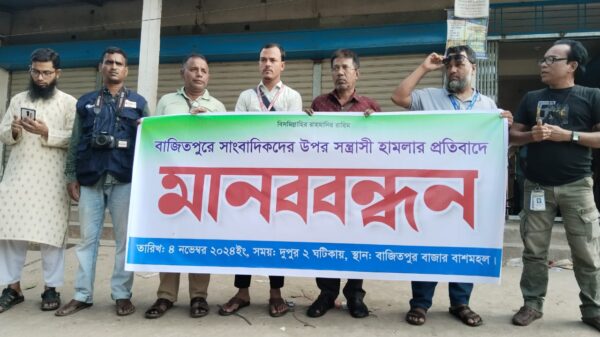 স্টাফ রিপোর্টার কিশোরগঞ্জের বাজিতপুরে সাংবাদিকদের উপর সন্ত্রাসী হামলার প্রতিবাদে মানববন্ধন ও প্রতিবাদ সভা করেছে উপজেলার স্থানীয় সাংবাদিকবৃন্দ। সোমবার ৪ নভেম্বর দুপুর ২ টার দিকে উপজেলার বাঁশমহল নামক এলাকায় এ