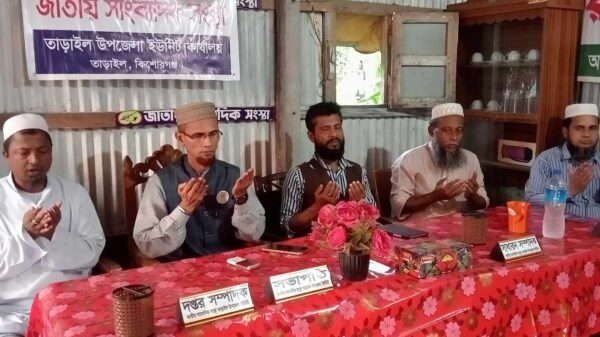 মোঃ শহিদুল ইসলাম, তাড়াইল উপজেলা প্রতিনিধি: কিশোরগঞ্জের তাড়াইলে জাতীয় সাংবাদিক সংস্থা তাড়াইল উপজেলা ইউনিট কর্তৃক আয়োজিত দোয়া ও আলোচনা সভা অনুষ্ঠিত হয়েছে। আজ শনিবার (২ নভেম্বর) বিকাল ৪ ঘটিকা জাতীয়