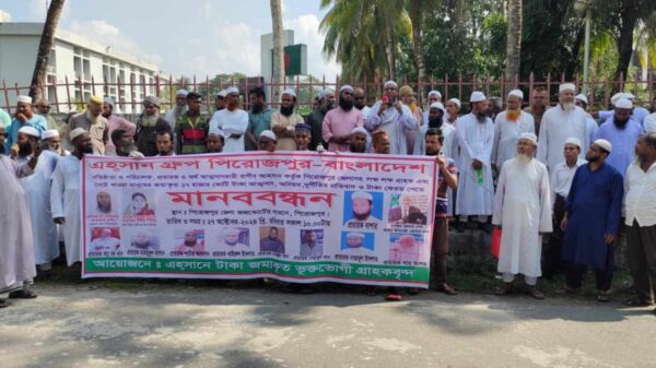 পিরোজপুর প্রতিনিধি: পিরোজপুরে এহসান গ্রুপের আত্মসাৎ করা টাকা ফেরত পাওয়ার দাবিতে গ্রাহকদের মানববন্ধন অনুষ্ঠিত । রবিবার সকালে পিরোজপুর শহরের জজ কোর্ট এর সামনের সড়কে ১০টা থেকে ঘণ্টাব্যাপী এ মানববন্ধনে