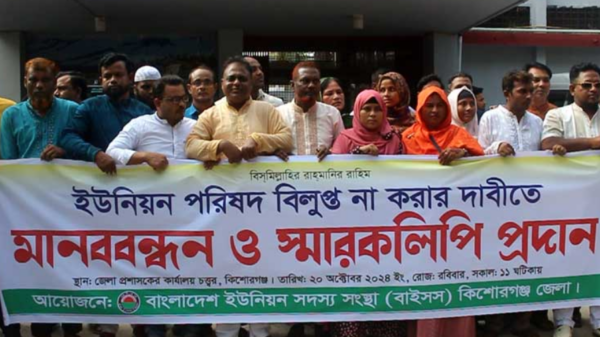 নিজস্ব প্রতিনিধি: ইউনিয়ন পরিষদ বিলুপ্ত না করার দাবীতে কিশোরগঞ্জে ইউপি সদস্যদরা মানববন্ধন, স্মারকলিপি প্রদান। ইউনিয়ন পরিষদের ইউপি সদস্যদের মেয়াদ পূর্ণ না হওয়া পযর্ন্ত বিলুপ্ত না করার দাবিতে কিশোরগঞ্জে মানববন্ধন ও