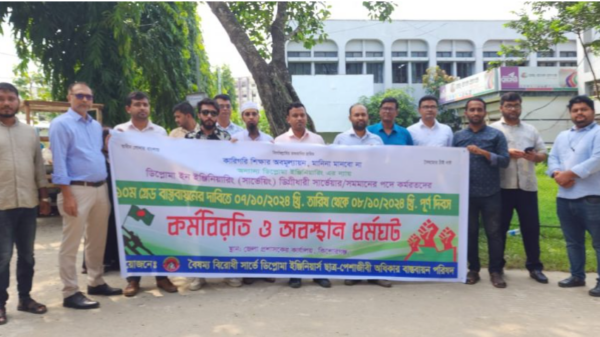 কিশোরগঞ্জ প্রতিনিধি সার্ভে ডিপ্লোমা ইঞ্জিনিয়ারদের বেতন কাঠামো ১০ম গ্রেড বাস্তবায়ন করার দাবিতে কর্মবিরতি ও অবস্থান ধর্মঘট করেছে কিশোরগঞ্জে কর্মরত সার্ভে ডিপ্লোমা ইঞ্জিনিয়াররা। সোমবার (৭ অক্টোবর) কিশোরগঞ্জ জেলা প্রশাসকের কার্যালয়ে