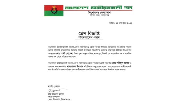 নিজস্ব প্রতিনিধি: কিশোরগঞ্জের নিকলীর ইউনিয়ন বিএনপির এক নেতাকে দল থেকে বহিষ্কার করা হয়েছে। আজ রোজ রবিবার ২২শে সেপ্টেম্বর) ২০২৪ খ্রীঃ নিকলীর দামপাড়া ইউনিয়ন বিএনপির আহ্বায়ক মোঃ আলী হোসেনকে বহিষ্কারের আদেশ