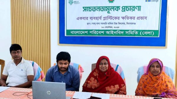 মিজানুর রহমান রিপন : বাংলাদেশ পরিবেশ আইনবিদ সমিতি ((বলা)’র উদ্যোগে আজ ১০ সেপ্টেম্বর ২০২৫ বুধবার কিশোরগঞ্জ জেলায় সরযূ বালা সরকারি বালিকা উচ্চ বিদ্যালয়ের হলরুমে একবার ব্যবহার্য প্লাস্টিকের প্রভাব শীর্ষক সচেতনতামূলক