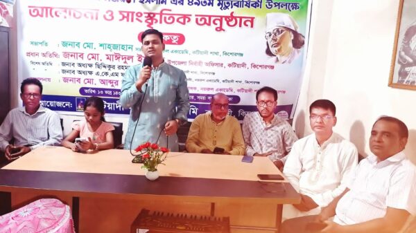 মাইনুল হক মেনু, স্টাফ রিপোর্টার : কিশোরগঞ্জের কটিয়াদীতে জাতীয় কবি কাজী নজরুল ইসলামের ৪৯তম মৃত্যু বার্ষিকী উপলক্ষে কটিয়াদী নজরুল একাডেমির কার্যালয়ে আলোচনা সভা ও সাংস্কৃতিক অনুষ্ঠান অনুষ্ঠিত হয়েছে। বৃহস্পতিবার সন্ধা