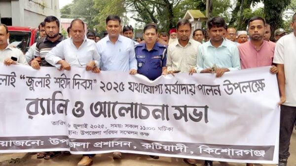 মাইনুল হক মেনু, স্টাফ রিপোর্টার : কিশোরগঞ্জের কটিয়াদীতে জুলাই শহীদ দিবস উপলক্ষে উপজেলা প্রশাসনের আয়োজনে র্যালি ও আলোচনা সভা অনুষ্ঠিত হয়েছে। এ উপলক্ষে উপজেলা পরিষদ চত্বর থেকে একটি র্যালি বের