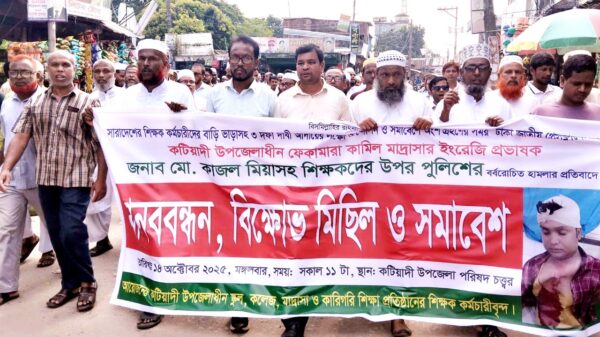 মাইনুল হক মেনু, স্টাফ রিপোর্টার : ঢাকায় জাতীয় প্রেসক্লাবের সামনে সারাদেশের শিক্ষক-কর্মচারীদের বাড়ি ভাড়াসহ তিন দফা দাবী আদায়ের লক্ষ্যে আন্দোলন ও সমাবেশে অংশগ্রহণের সময় কিশোরগঞ্জের কটিয়াদী উপজেলার ফেকামারা কামিল মাদ্রাসার